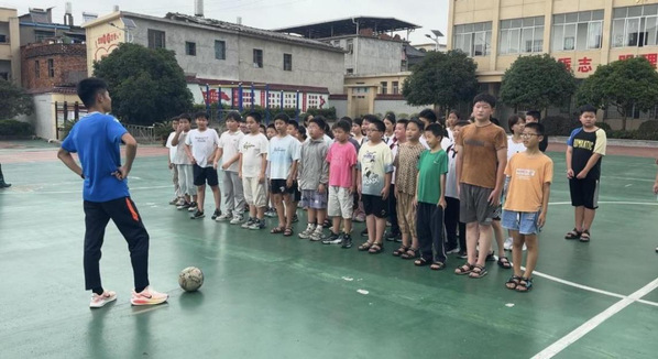 篮球场上,足球教学课点燃了学生们的运动热情。支教老师围绕足球基本技术与战术意识展开教学,从脚内侧传球的发力技巧到团队传切配合的战术逻辑,进行系统讲解与示范。学生们踊跃参与、积极实践,在绿茵场的奔跑传接中,既收获了运动技能,又培养了团队协作精神,为乡村校园足球文化建设添砖加瓦。