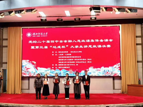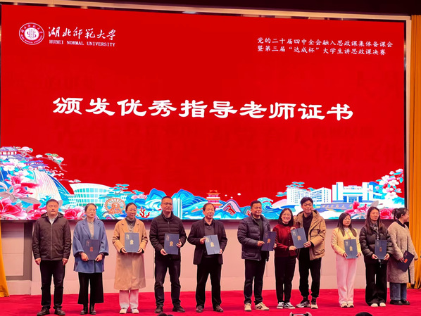 本网讯 2025年12月12日下午,湖北师范大学学习贯彻党的二十届四中全会精神融入思政课集体备课会暨第三届“达成杯”大学生讲思政课决赛在教育大楼报告厅成功举办。体育学院参赛团队表现出色,荣获决赛“优秀奖”,团队指导老师彭覃获评“优秀指导老师”。