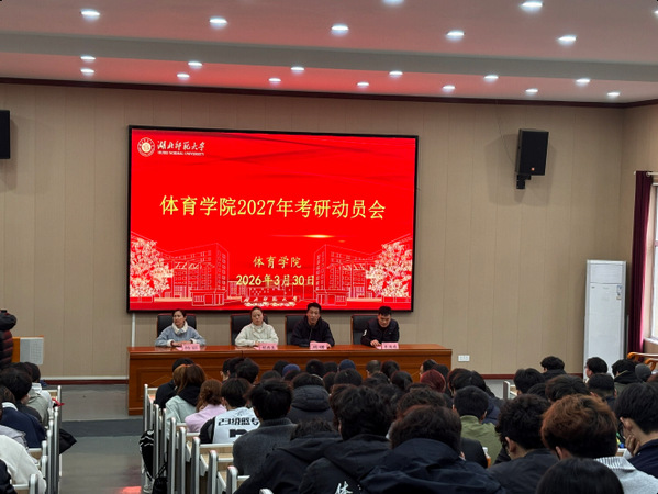 本网讯 为进一步帮助大三学生明确考研目标、科学规划备考路径,3月30日,体育学院在艺术大楼报告厅召开2027年考研动员会。学院党委书记胡燕生、院长周曙、党委副书记杨丽、副院长朱施成、院长助理田广、各系部主任以及2023级全体班主任和辅导员参加会议。会议由学院党委副书记杨丽主持。