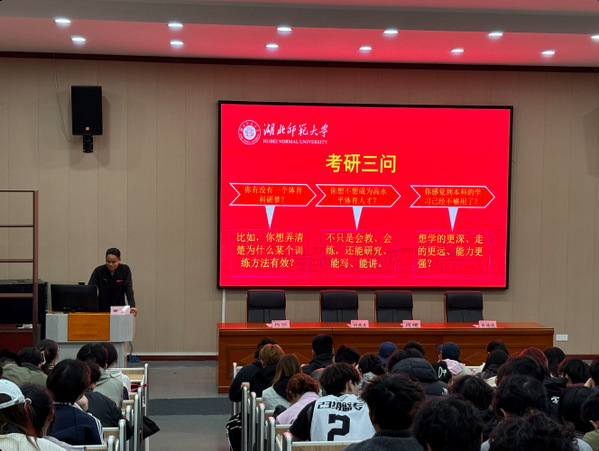 随后,院长助理田广博士以自身求学经历为依托,围绕“考研三问”展开演讲。他引导同学们深入思考三个问题:“你有没有一个体育科研梦?”“你想不想成为高水平体育人才?”“你感觉本科学历够不够用?”田广结合自身成长经历与学科发展前景,鼓励大家坚定信念、敢于追梦,并祝愿同学们“相信自己,一战成硕”。
